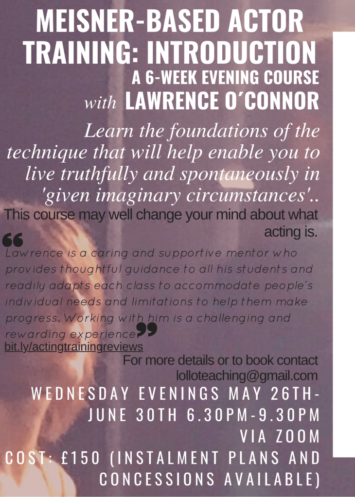 For anyone interested in the Meisner Technique approach to acting training that enables its practitioners to ‘live truthfully in given imaginary circumstances.